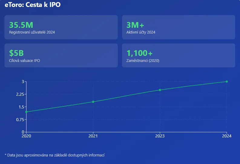 Izraelská investiční platforma eToro se konečně chystá na krok, o kterém se šuškalo už dlouho – vstup na americkou burzu. A není to zrovna malé sousto. Dokumenty už leží na stole u americké Komise pro cenné papíry (SEC) a valuace? Ta by mohla dosáhnout závratných 5 miliard dolarů! Na počátku roku 2024 evidovala společnost 35,5 milionu lidí, kteří si vytvořili účet. Z tohoto počtu byly více než 3 miliony účtů aktivně financovány uživateli.