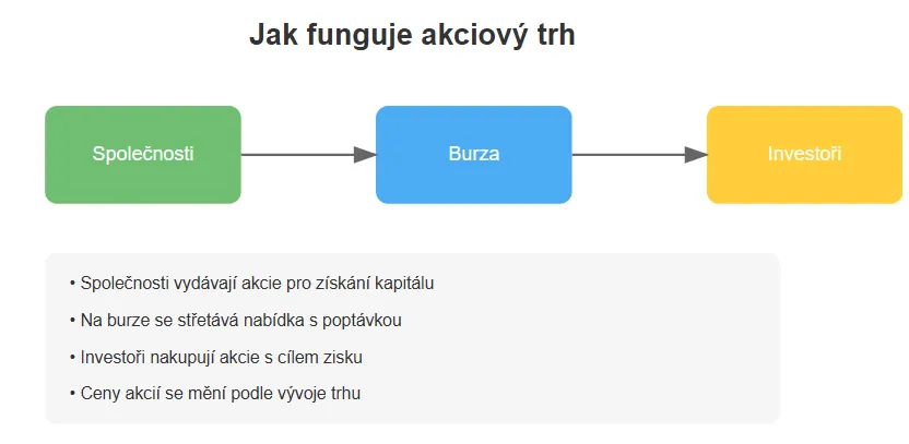 Základní princip fungování akciového trhu: společnosti vydávají akcie, ty se obchodují na burze, kde je kupují a prodávají investoři.