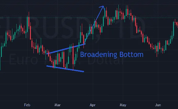 Cenová formace Broadening Bottom je podobná rozšiřujícímu se vrcholu, ale v opačném směru. Stejně jako u rozšiřujícího se vrcholu tvoří i rozšiřující se spodní část obrazce symetrický trojúhelník. Rozšíření horní části je vzácný jev, stejně tak jako rozšíření spodní části. Broadening Bottom je považován za býčí reverzní pattern. Formaci tedy tvoří dvě různoběžné linie, které jsou vodorovně symetrické. Jde tedy o obrácený symetrický trojúhelník.