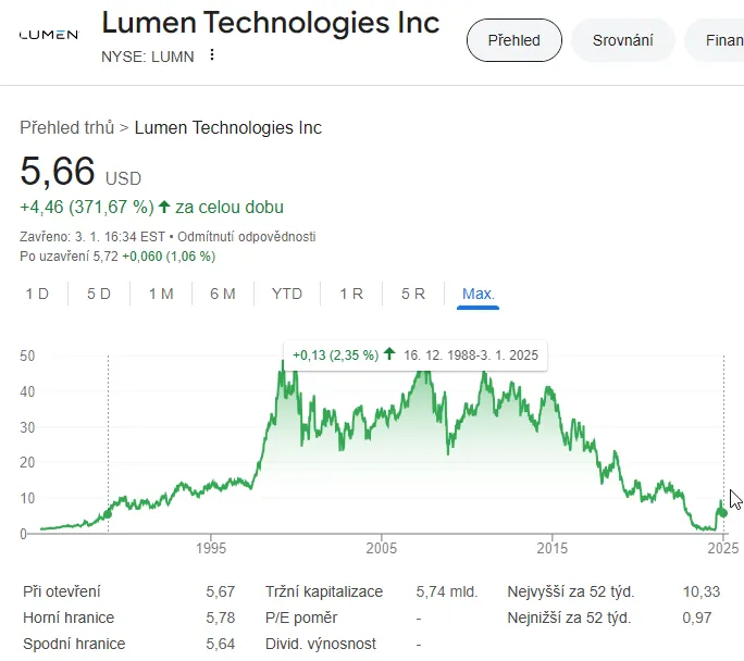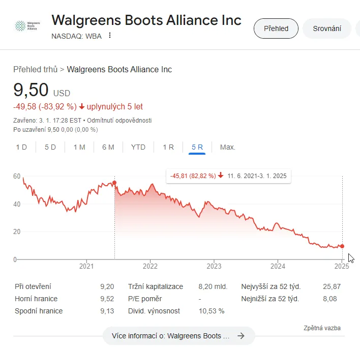 Typický příklad velké dividendové společnosti. Pád akcií může trvat několik let. Nepovedené akvizice, nedostatek růstu i další příčiny.