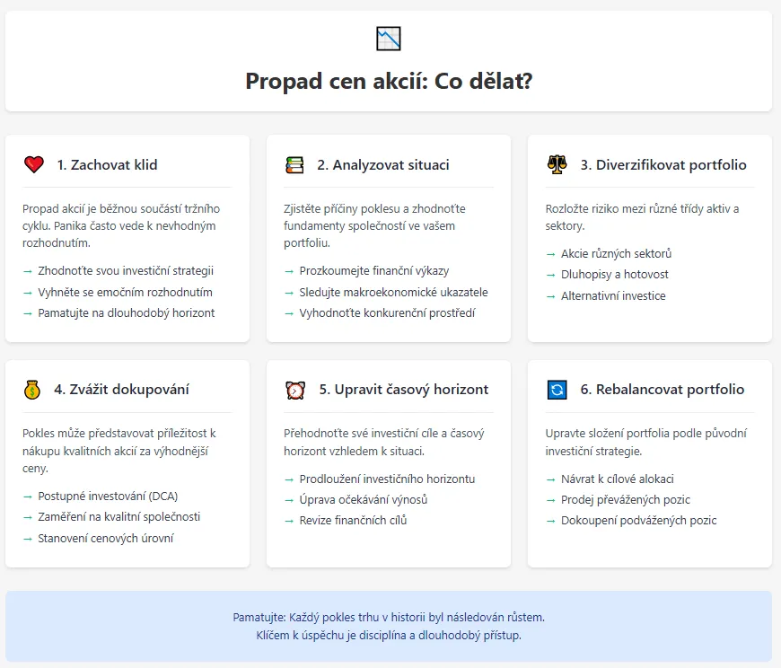 V tomto článku se podíváme na všechny možné přístupy, které máme k dispozici, pokud dojde k poklesu ceny naší investice. Probereme, zda je lepší akcie nadále držet, dokupovat další, prodat je, nebo se zajistit proti dalšímu propadu. U každé možnosti uvedeme výhody, nevýhody a kdy je vhodné ji zvolit.