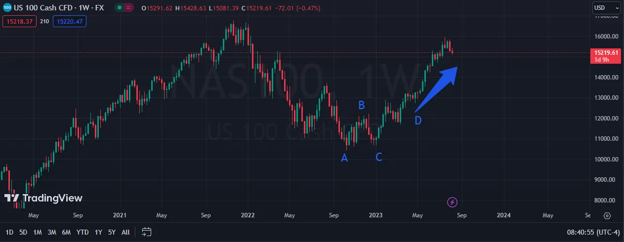 Dvojité dno se nachází ve svém závěrečném stadiu. Výrazný prodej v bodě A může být interpretován jako akumulace kapitálu ze strany dlouhodobých investorů, kteří vidí potenciál. Opakované testování minima v bodě C znamená konec negativního trendu a začátek nákupů za výhodných podmínek. V této fázi se na trhu šíří pozitivní zprávy a rally v bodě D se projevuje růstem objemu obchodů.