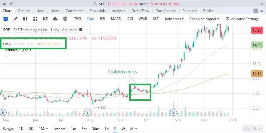 Základem pro identifikaci Golden Cross jsou dva klouzavé průměry – krátkodobý a dlouhodobý. Na přiloženém grafu akcií společnosti Sofi Technologies (SOFI) můžeme vidět tyto průměry znázorněné pomocí zelené linky pro 50denní EMA a oranžové linky pro 200denní EMA. Klíčovým momentem je jejich vzájemné protnutí.