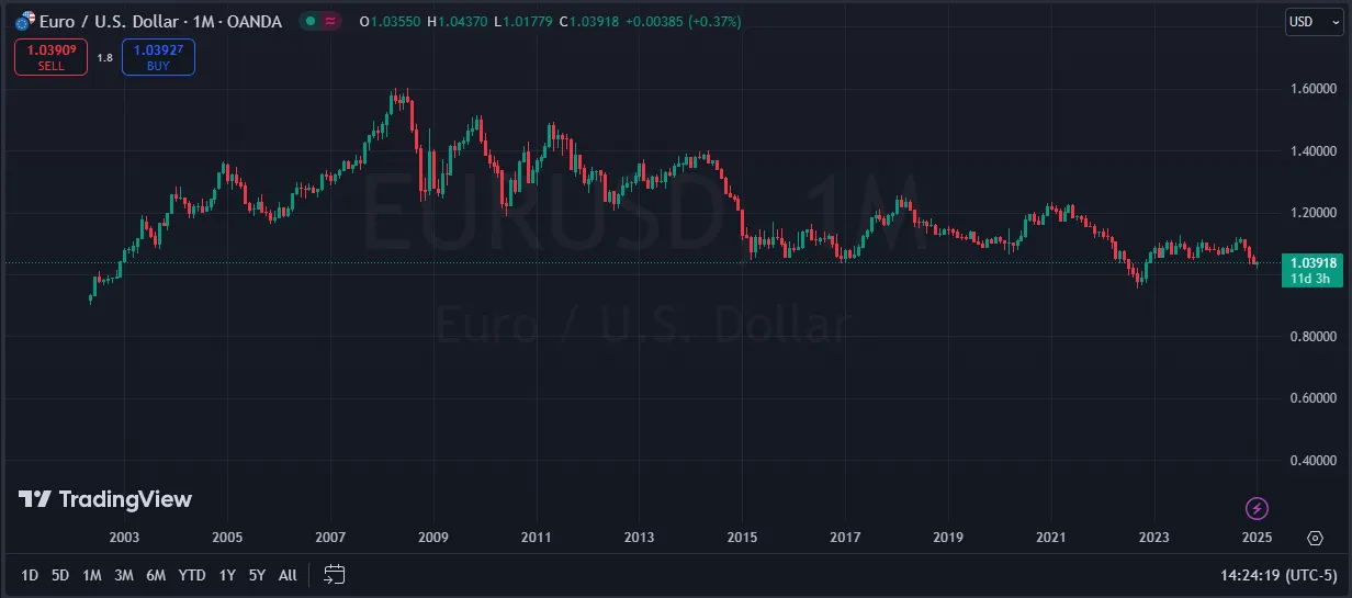 Pohled na historický graf nám připomíná, že kurz EUR/USD je víc než jen číslo. Je to barometr relativní síly dvou největších ekonomických bloků světa, jejich problémů i úspěchů.