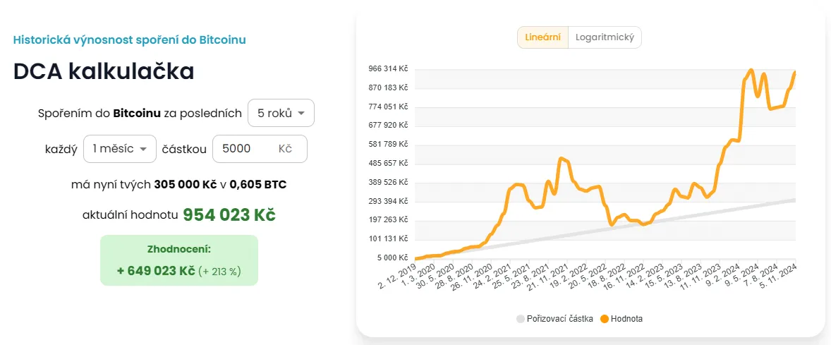 Řekněme, že se chceme investovat 5 000 Kč měsíčně do Bitcoinu. Bez ohledu na to, jestli cena Bitcoinu roste nebo klesá, každý měsíc investujeme stejnou částku. Když je cena Bitcoinu nízká, za svých 5 000 Kč získáme více Bitcoinu; když je cena vyšší, dostaneme za stejnou částku Bitcoinu méně. Tento přístup tě chrání před velkými ztrátami v případě, že bychom investovali jednorázově v nevhodný okamžik, kdy je cena vysoko.