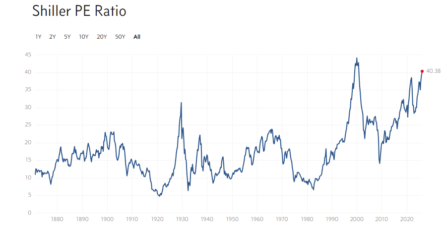 Shillerovo CAPE ratio (cyklicky adjustovaný poměr ceny a zisku) je jedním z nejlepších dlouhodobých prediktivních ukazatelů. Když je CAPE vysoko nad historickým průměrem (cca 17 pro americký trh), budoucí desetileté výnosy jsou typicky nízké. Když je CAPE nízko, budoucí výnosy jsou typicky vysoké. Vztah není dokonalý — ale je statisticky silný a konzistentní přes více než sto let dat.