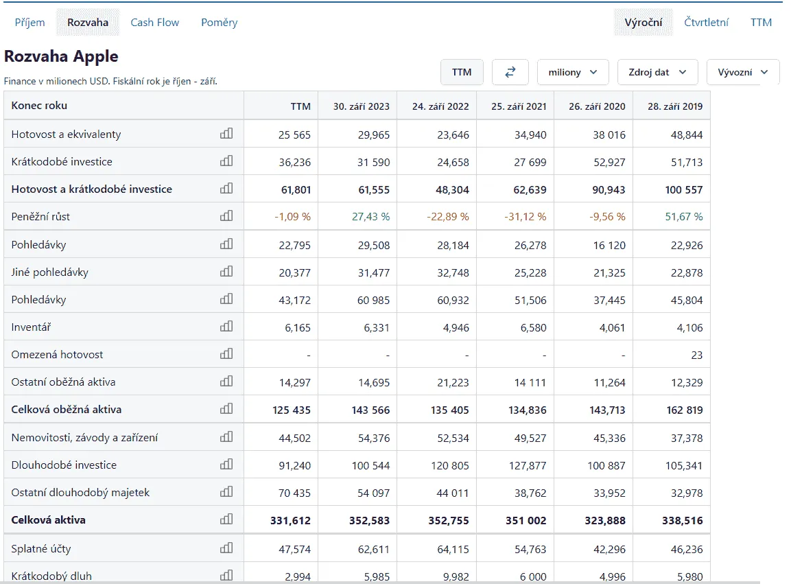 - Dlouhodobá aktiva: Zahrnují nemovitosti, závody, zařízení, dlouhodobé investice a ostatní dlouhodobý majetek. Celková aktiva společnosti Apple v roce 2023 činila 331 612 milionů USD.