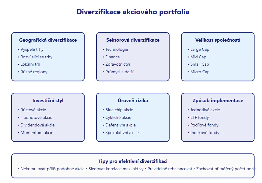 Namísto rozdělení portfolia mezi různé druhy aktiv mohou investoři diverzifikovat pouze v rámci akciového trhu. Jednou z možností je rozložení investic mezi různé sektory – například mezi technologii, energetiku, zdravotnictví nebo finance. Taková diverzifikace může pomoci snížit vliv negativních trendů v jednom odvětví. Další možností je regionální diverzifikace, která využívá akcie z různých částí světa. Různé trhy mohou reagovat odlišně na globální ekonomické podmínky.