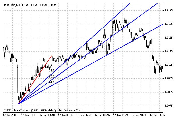 Další nástroj na studii linií, Fibonacci Vějíř sestavíte následovně: například od dna k opačnému vrcholu se zakreslí trendová linie mezi dvě extrémní body. Pak se automaticky zakreslí “neviditelná” vertikální linie přes druhý extrémní bod. Dále se zakreslí tři trendové linie protínající tuto neviditelnou vertikální linii v Fibonacci úrovních 38,2; 50; 61,8% z prvního extrémního bodu.
