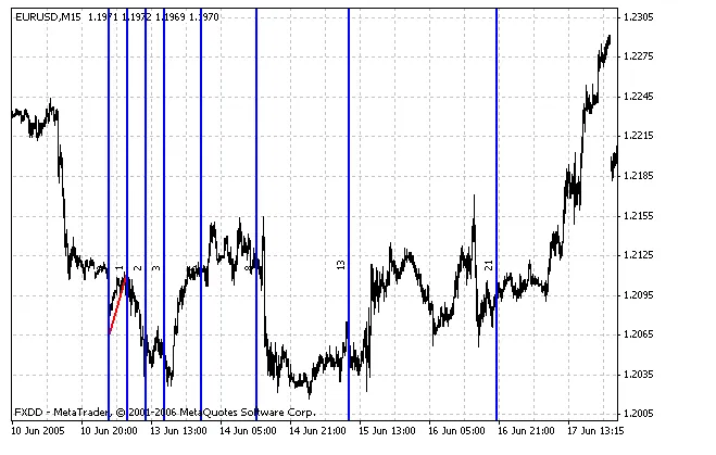 Je to řada vertikálních linií, které mají Fibonacci intervaly 1, 2, 3, 5, 8, 13, 21, 34, atd. … Významné cenové změny jsou obvykle očekávané poblíž těchto linií. Abyste mohli tento nástroj sestavit, musíte specifikovat dva body, abyste determinovalo délku intervalu jednotky. Všechny ostatní linie jsou připravovány na základě intervalu jednotky podle Fibonacci Čísel.