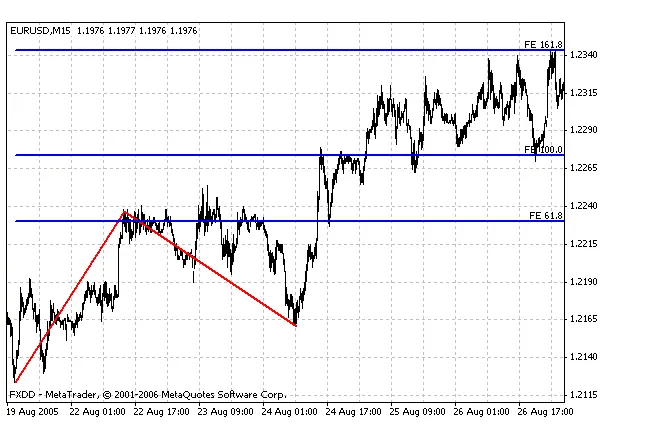 Konec druhé vlny slouží jako referenční bod pro postavení neviditelné vertikální linie. Korespondující linie se zakreslí od referenčního bodu na intervalu rovné 61,8; 100 a 161,8% intervalu jednotky. Předpokládá se, že třetí vlna ukončí poblíž těchto úrovní.