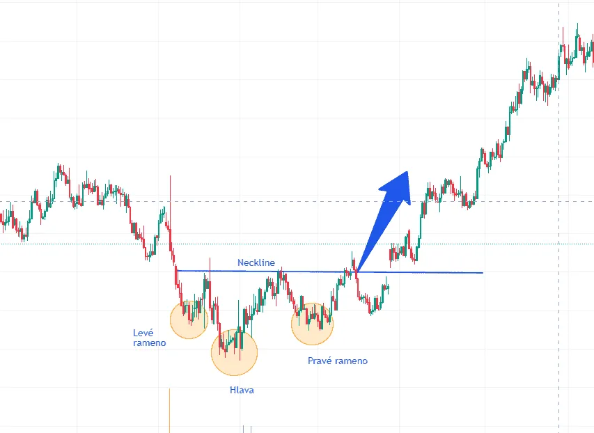 Celá formace tak vytváří tvar, kde jsou hlava a ramena obklopeny nižšími úrovněmi cen. Po vytvoření obrácené hlavy a ramen se očekává, že cena aktivu začne stoupat, což může signalizovat obrat z medvědího (bearish) na býčí (bullish) trend.