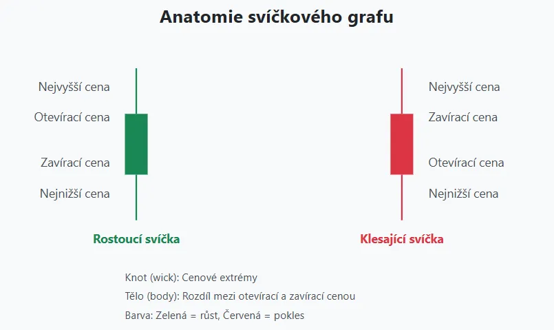 Každá svíčka zobrazuje čtyři klíčové cenové úrovně během zvoleného časového úseku: Otevírací cena (začátek těla). Zavírací cena (konec těla). Nejvyšší cena (horní knot). Nejnižší cena (spodní knot).