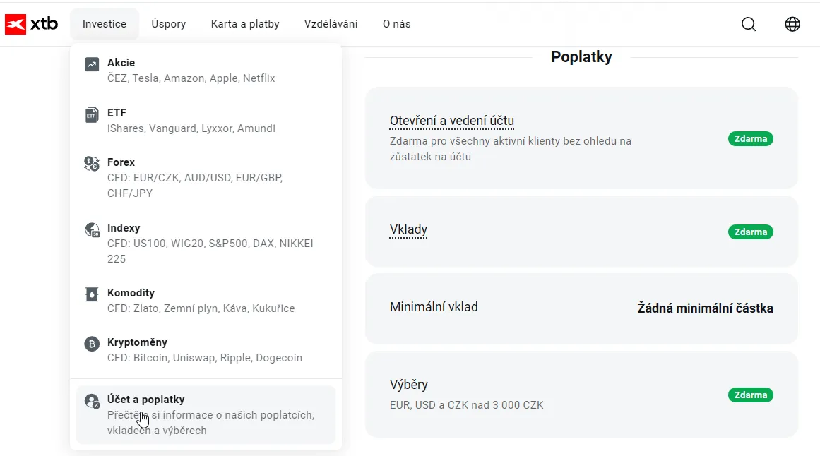 Při obchodech v cizí měně může být účtován konverzní poplatek 0,5 %. Pro malé částky XTB nabízí frakční práva, takže investovat lze už od nízkých nominálů (v produktových materiálech se uvádí investice od cca 10 €; u Investičních plánů od 15 €). Pro pasivní přístup slouží Investiční plány s automatickými platbami do vybraných ETF a s nulovými poplatky v rámci měsíčního limitu 100 000 EUR.