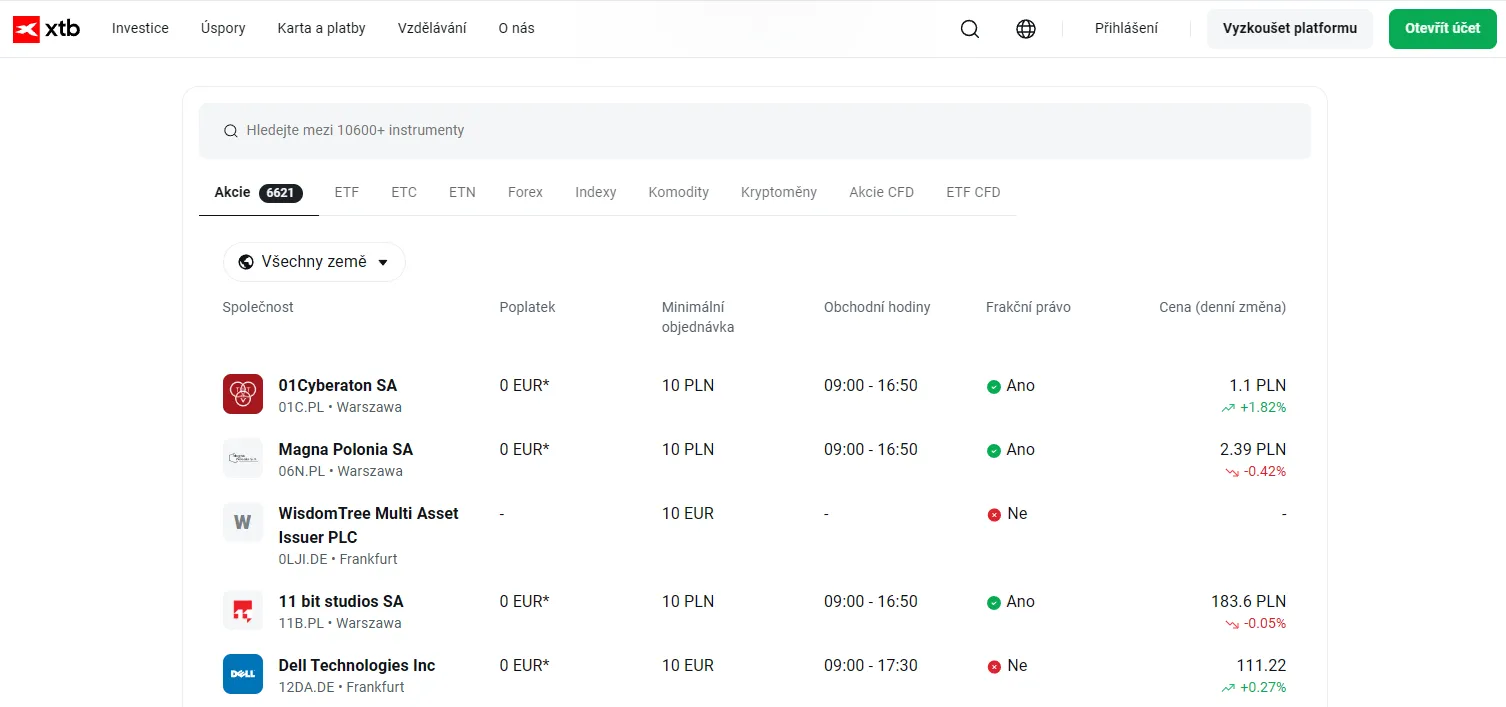 Jeden z nejlepších praktických tipů, jak efektivně využít web XTB, se týká ověření produktové nabídky. Častým problémem investorů je, že projdou celým registračním procesem u brokera jen proto, aby následně zjistili, že konkrétní akcie, ETF nebo jiný instrument, který chtějí obchodovat, není v nabídce. XTB tento problém elegantně řeší kompletně veřejnou a interaktivní databází všech nabízených instrumentů.