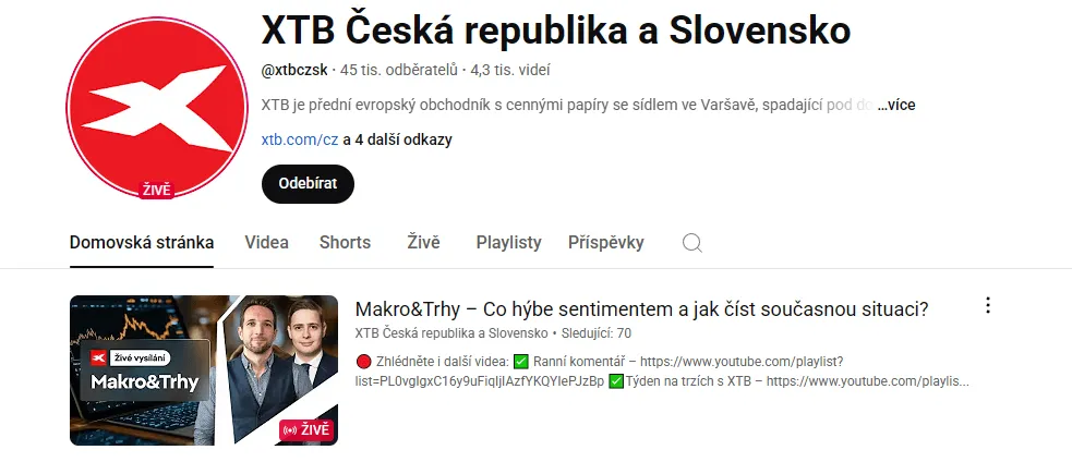 YouTube kanál XTB (Česká republika a Slovensko) s přibližně 45 tisíci odběrateli na adrese https://www.youtube.com/@xtbczsk je skvělým doplňkem webu i platformy. Najdete na něm každodenní obsah v češtině a slovenštině: