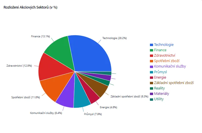 Interaktivní koláčový graf zobrazující rozložení hlavních akciových sektorů s jejich procentuálním zastoupením. Data se mohou měnit a přibližně odpovídají typickému rozložení v globálních akciových indexech.