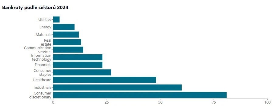 Consumer discretionary (spotřební zboží) vede žebříček s 81 bankroty, což naznačuje významné problémy v sektoru volnočasového zboží a služeb. Následují průmyslové podniky (60 bankrotů) a zdravotnictví (48 bankrotů).