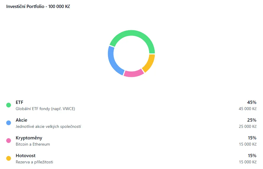 Výzkumy opakovaně ukazují, že pasivní strategie dlouhodobě porážejí až 80 % aktivně řízených fondů, a to především díky nižším poplatkům a eliminaci lidských chyb při investičním rozhodování. Jak tedy konkrétně rozložit 100 000 Kč? Na základě dlouhodobých dat a současné situace na trzích doporučujeme následující rozdělení portfolia: