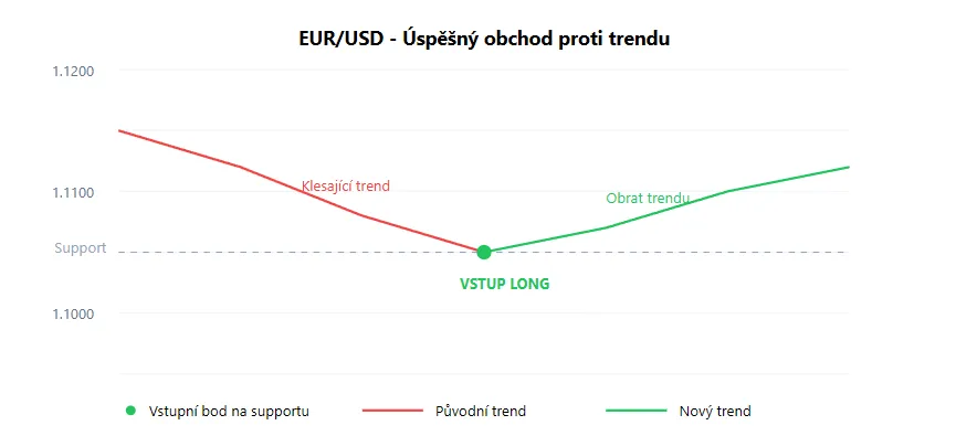 Pokud máme klesající trend, můžeme hledat příležitosti pro long pozice na úrovních supportu. Tyto úrovně představují historické minimální ceny, kde se již dříve trend zastavil. Když se cena přiblíží k těmto úrovním, můžeme očekávat:
