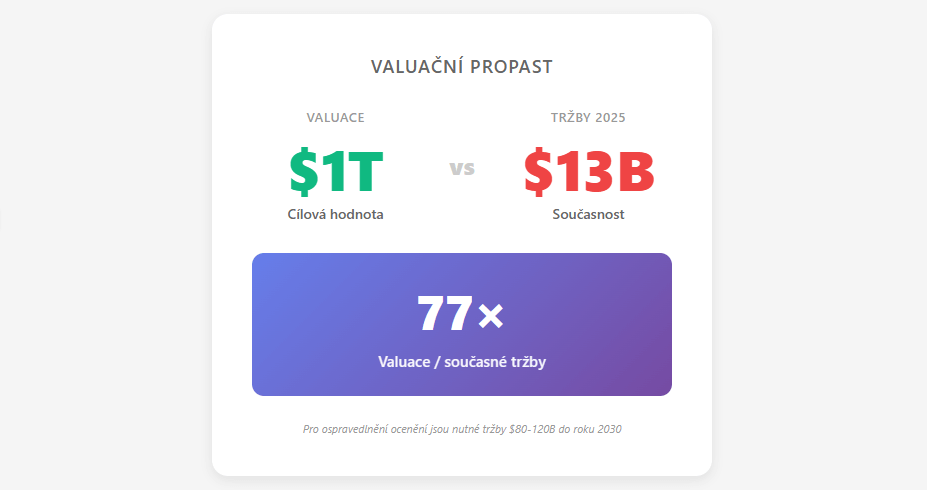 OpenAI při valuaci 1 bilion dolarů musí dosáhnout příjmů přibližně 80–120 miliard dolarů ročně do roku 2030, aby ospravedlnila takové ocenění při zralém násobku P/S 10–15×. To znamená osminásobný až desetinásobný nárůst za čtyři až pět let, a to v odvětví, kde marže jsou pod permanentním tlakem a konkurence disponuje hlubšími kapsami.