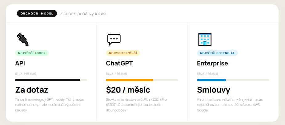 Stovky milionů uživatelů učinily z ChatGPT nejrychleji rostoucí spotřebitelskou aplikaci v dějinách internetu. Předplatné Plus a dražší tier Pro generují předvídatelný měsíční příjem. Odhadované celkové tržby OpenAI za rok 2025 se pohybují kolem 12–13 miliard dolarů s projekcí zdvojnásobení v roce 2026. Zásadní nejistota spočívá v konverzním poměru — kolik z těch stovek milionů uživatelů je ochotno trvale platit 20 nebo 200 dolarů měsíčně v prostředí, kde Google, Meta a desítky open-source projektů nabízejí stále kvalitnější alternativy.