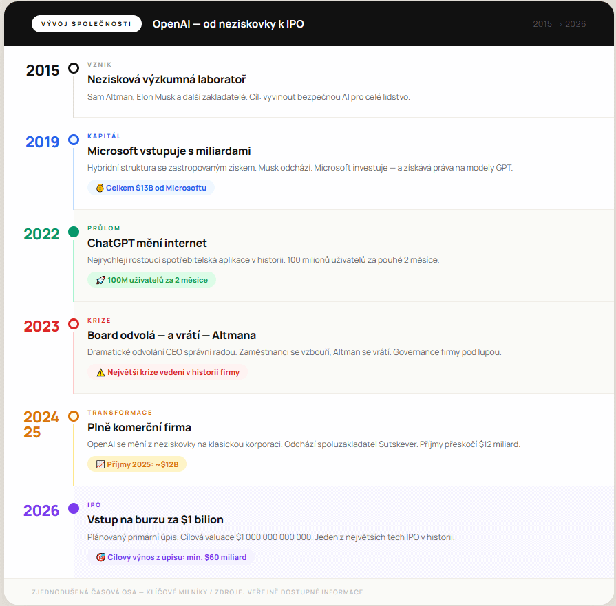 Málokterá firma přicházející na burzu nese na zádech tak komplikovanou korporátní historii. OpenAI byla založena v roce 2015 jako nezisková výzkumná laboratoř s posláním vyvinout umělou obecnou inteligenci ve prospěch celého lidstva. Mezi zakladatele patřili Sam Altman i Elon Musk, který projekt později opustil.