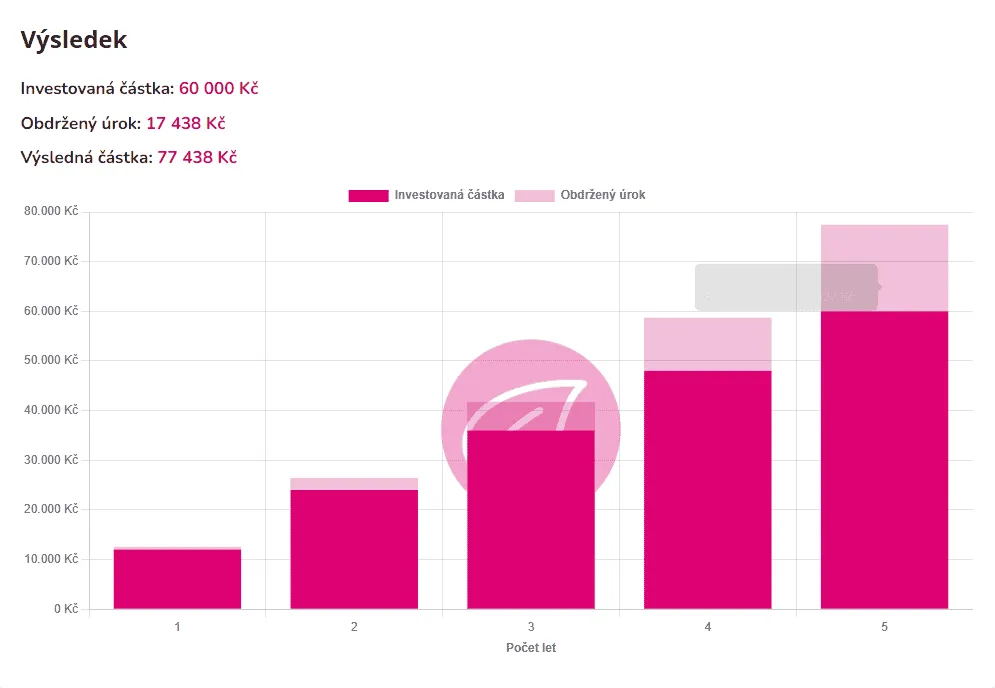 | Rok | Celkově zainvestováno (Kč) | Celkový úrok (Kč) | Hodnota portfolia (Kč) |