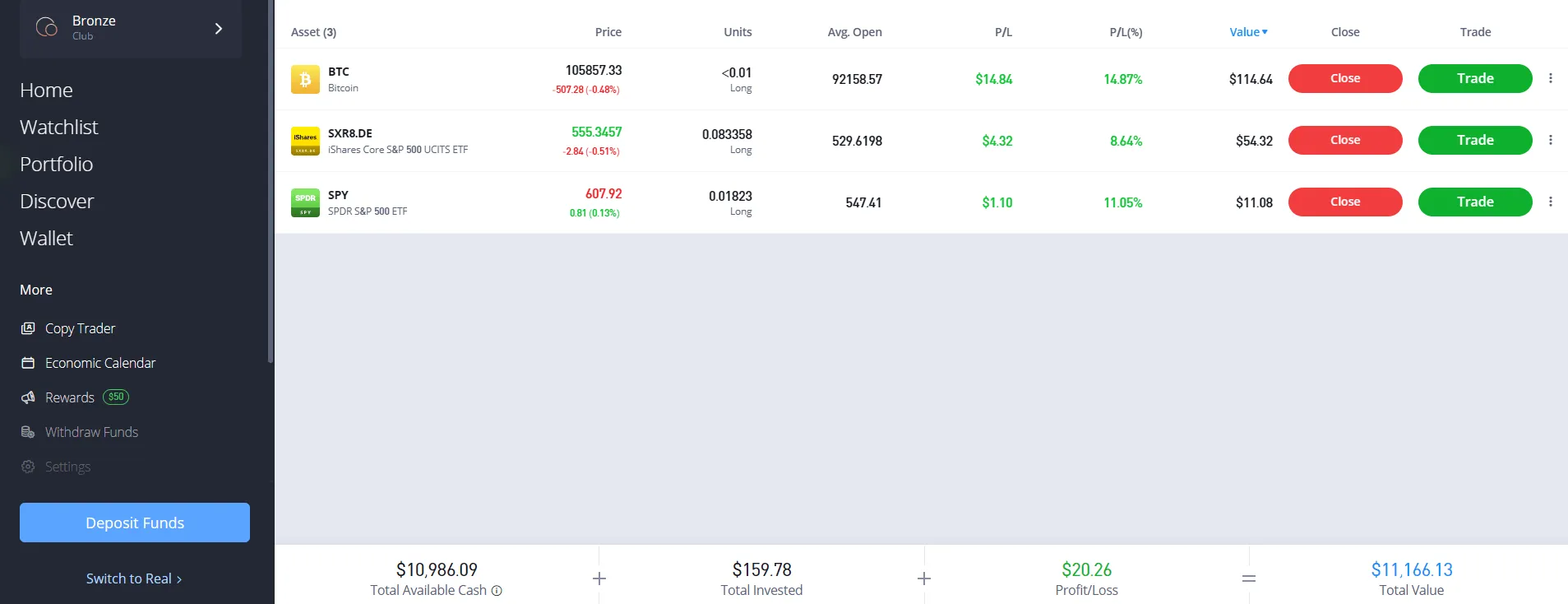 Chcete se zaměřit právě na akcie a ETF? Demo účet je pro to ideální. U brokerů jako XTB nebo eToro si můžete vyzkoušet nákup akcií a sledovat, jak se vaše portfolio vyvíjí v čase. Kvalitní simulátor věrně napodobuje reálné obchodování, a to včetně poplatků. Není to jen o tom, jestli cena roste nebo klesá. Přímo na demo účtu uvidíte, jak se vám z obchodů strhávají spready, swapy (poplatky za držení pozice přes noc) nebo případné komise.