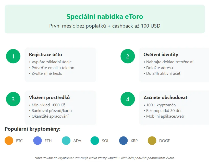 Registrace a začátek obchodování na eToro je jednoduchý proces rozdělený do čtyř hlavních kroků. V rámci speciální nabídky získáte první měsíc obchodování zcela bez poplatků s možností cashbacku až 100 USD.
