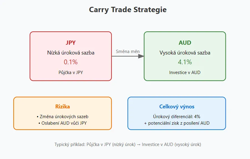 Jednou z populárních strategií je tzv. carry trade, která těží z úrokových diferenciálů mezi měnami. Obchodníci si půjčují v měně s nízkou úrokovou sazbou a investují do měny s vysokou sazbou. Kromě zisku z úrokového diferenciálu mohou profitovat i z případného posílení cílové měny.
