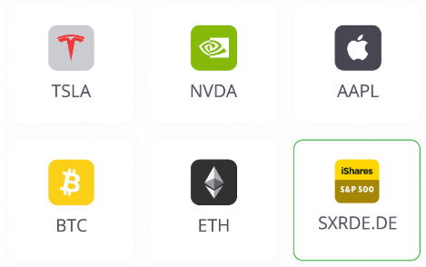 V současné době si můžete vybrat z šesti investičních možností: K registraci můžete získat zdarma kryptoměny Bitcoin a Ethereum, akcie společností Tesla, Nvidia a Apple nebo ETF iShares Core S&P 500 UCITS ETF USD (Acc), které sleduje vývoj indexu S&P 500 na americké burze. 1 vybrané aktivum bude automaticky připsány na váš obchodní účet bez dalších nákladů, podle výše vašeho vkladu.